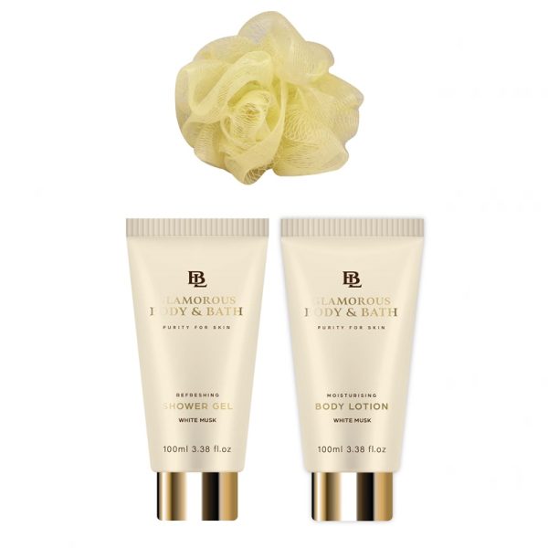 σετ δώρου σε νεσεσέρ με χρυσό χρώμα και άρωμα white musk , που περιλαμβάνει 100ml Body Lotion,100ml Shower Gel και 1 σφουγγάρι.
